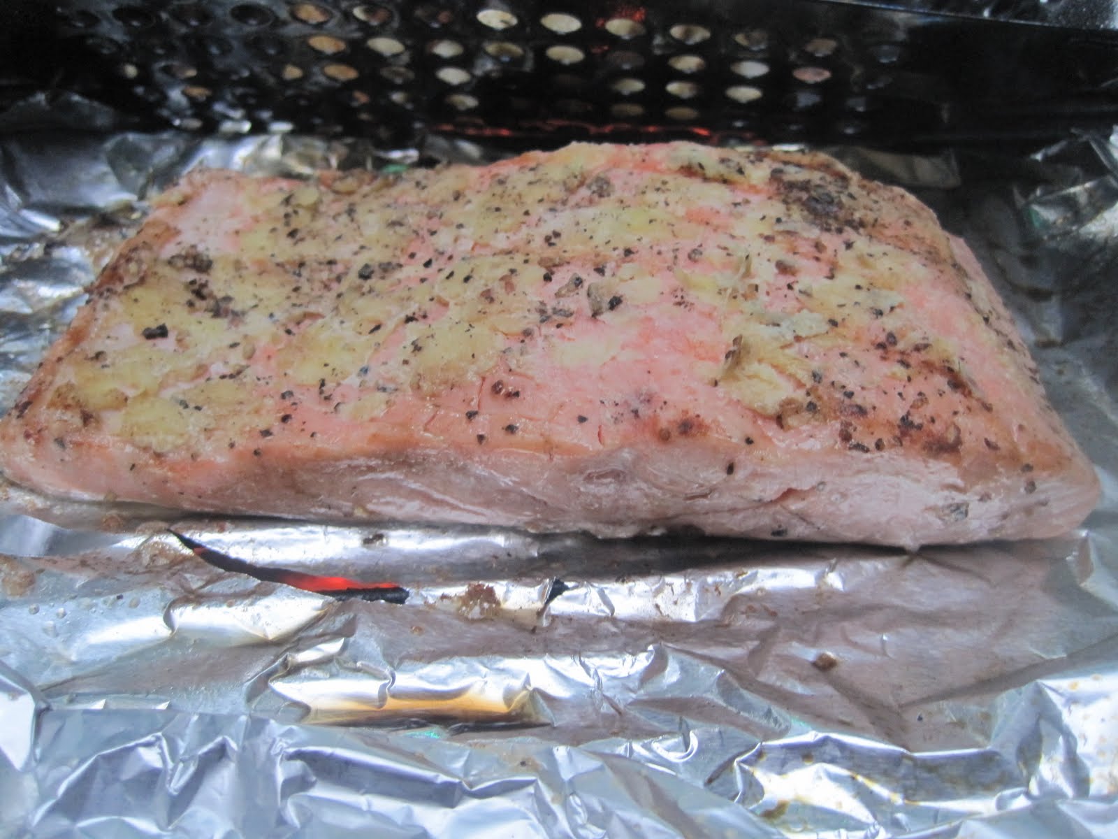 6. Lay the foil (spray-side-up) on your hot grill and put the salmon with the ginger side down on the grill.