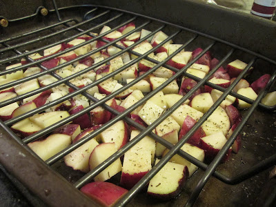2. Chop the potatoes into 1 inch cubes and lay on the bottom of a roasting pan that has a rack. Sprinkle with about 1/2 tsp. salt, 1/4 tsp. pepper, and 1/2 tsp. Herbs de Provence.