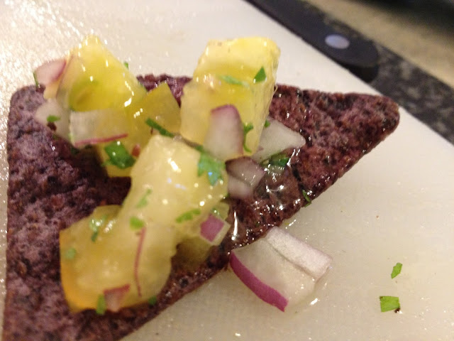 This is a very simple, refreshing and delicious salsa that I made using fresh yellow tomatoes from my garden. You may not know this, but eating a raw tomato of any kind is a big step for me. I like to think of myself as an adventurous eater, but the only food I don't like is raw tomatoes. Something about the texture and raw flavor just doesn't do it for me. Then I discovered the much more mild and subtle yellow tomato and I've become hooked. I am using them as fast as I can grown them and I've never been happier. My backyard gets lots of southern exposure, so that means tons of bright DC sunlight. The tomato plants are soaking it up and growing like weeds. I can't use them fast enough, so I'm inundating my poor neighbors with bags of produce. Since this salsa is so easy to make, with with only a few ingredients, it is perfect to throw together as an appetizer or as a topping for weeknight tacos. You can certainly use red tomatoes, if you have them, but if you can get ahold of yellow tomatoes for a reasonable price, give this a try with the yellows. It will be worth it!